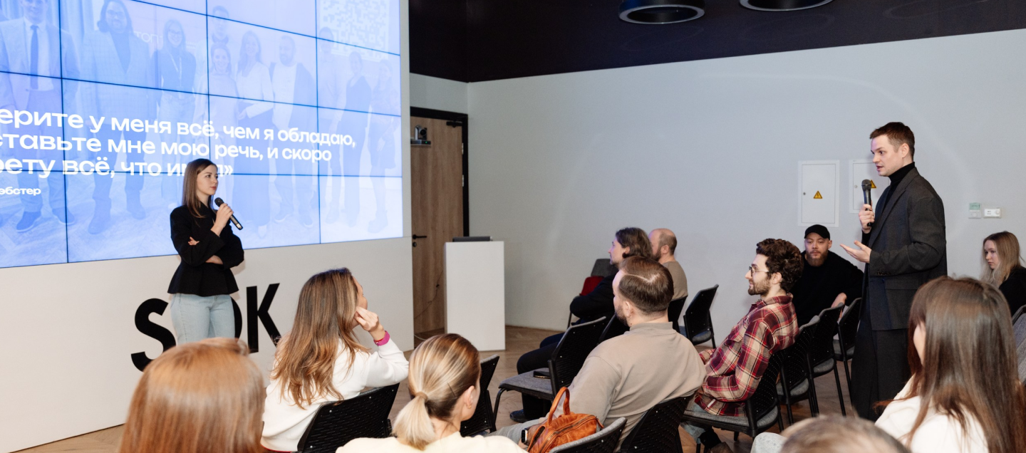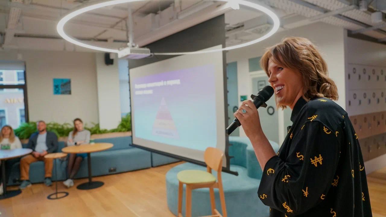 Проводим практические занятия с основателем школы управления коммуникацией «ТОП 10», тренером по технике речи и публичным выступлениям. Работаем над уверенностью через коммуникации и учимся говорить красиво и эффектно